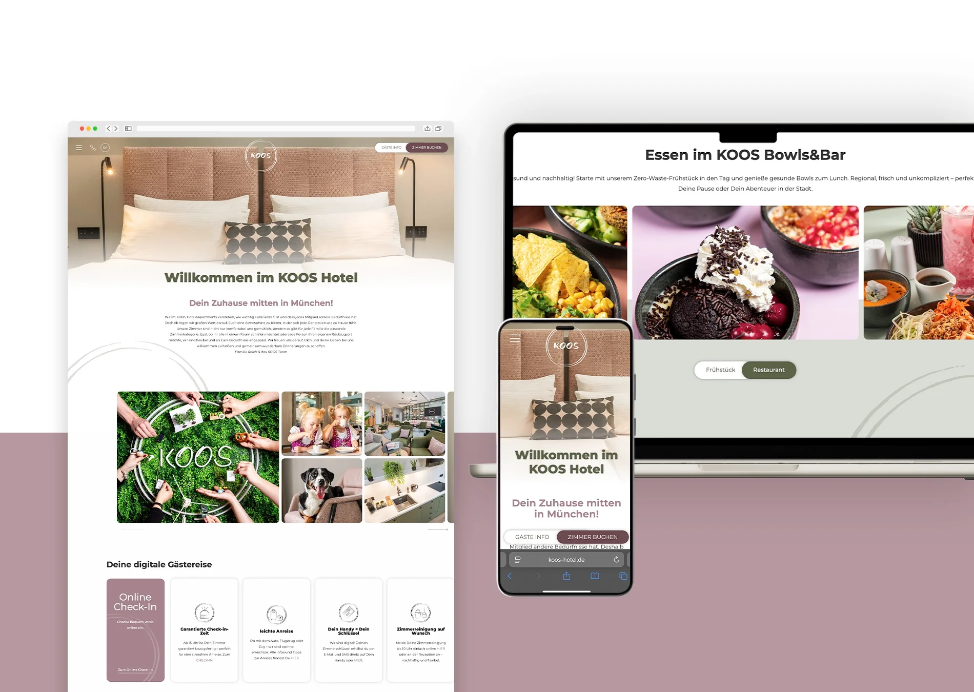 Bei der Gestaltung lag unser Fokus darauf, die warme Gastfreundschaft und die nachhaltigen Werte des Hauses zu präsentieren. Wir haben großen Wert auf intuitive Navigation, ansprechende Visualisierung und eine informative Struktur gelegt, die Gästen hilft, schnell die passenden Informationen zu finden und ihren Aufenthalt direkt online zu planen. Dank des neuen Webdesigns kann sich das KOOS Hotel modern, einladend und authentisch im digitalen Raum positionieren, ganz im Geist des Hauses.